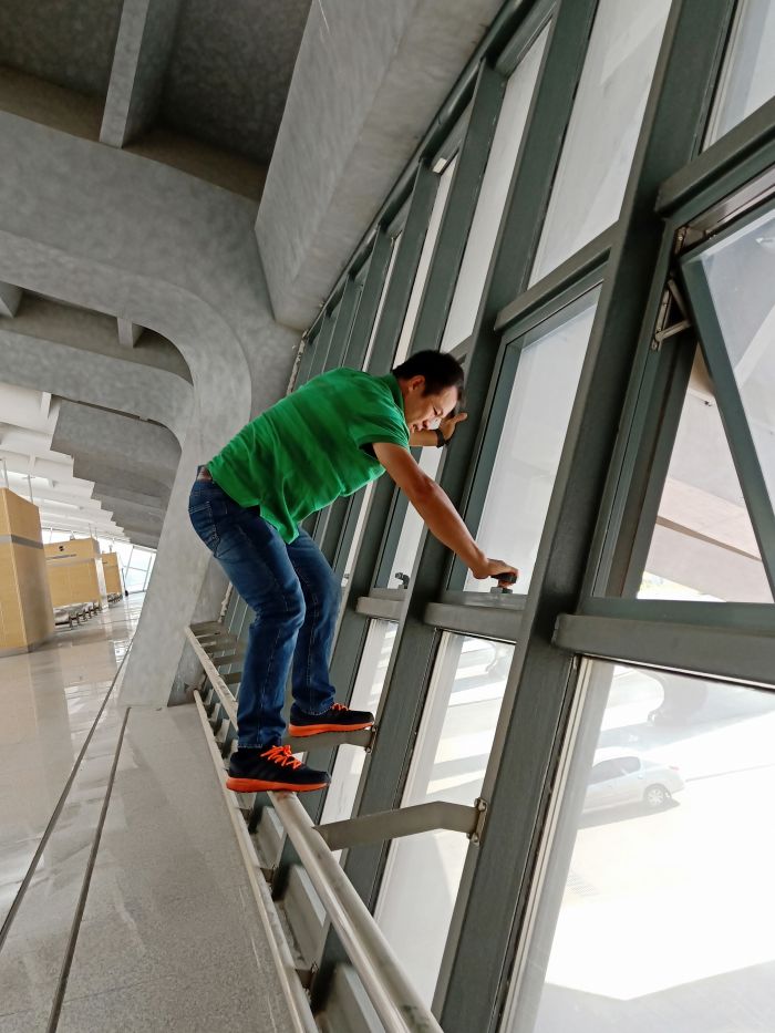 主站樓部分是攻堅(jiān)之戰(zhàn),30位員工在透明的頂棚下感受悶熱灼曬、揮汗如雨,每一塊地磚都是經(jīng)過(guò)了水沖、塵推、除塵、清洗、抹凈、擦干等六道工序,方可達(dá)標(biāo)。上下兩層共26912平方米,經(jīng)過(guò)兩天半的時(shí)間終于完工,看著光亮如新、纖塵不染的候車(chē)廳,所有員工的臉上都綻放了發(fā)自?xún)?nèi)心的微笑。