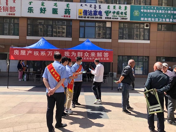 在祥和苑公租房小區(qū)社區(qū)服務中心,志愿者們向廣大群眾詳細的介紹了公租房購買條件和流程,以及辦理不動產權證等政策知識,并為購房群眾現(xiàn)場發(fā)放了辦理不動產權證的發(fā)票和網簽合同。同時大家還主動前往小區(qū)人流較多的北門,熱情的向廣大群眾發(fā)放了公司專門制作的公租房銷售和不動產權證宣傳圖冊,耐心的為群眾解答購買公租房和辦理產權政策的各項疑慮、困惑。