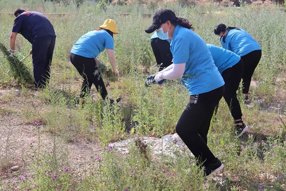 活動(dòng)現(xiàn)場,黨支部書記娜仁、經(jīng)理史濤帶領(lǐng)大家在各自的責(zé)任區(qū)域內(nèi)分片作業(yè)。大家在炎炎烈日下,揮汗如雨、干勁十足,有的拔除蒿草、有的收集清運(yùn)……經(jīng)過一下午地辛勤作業(yè),小區(qū)及周邊的蒿草不見了,空氣清新了,環(huán)境也變美了。